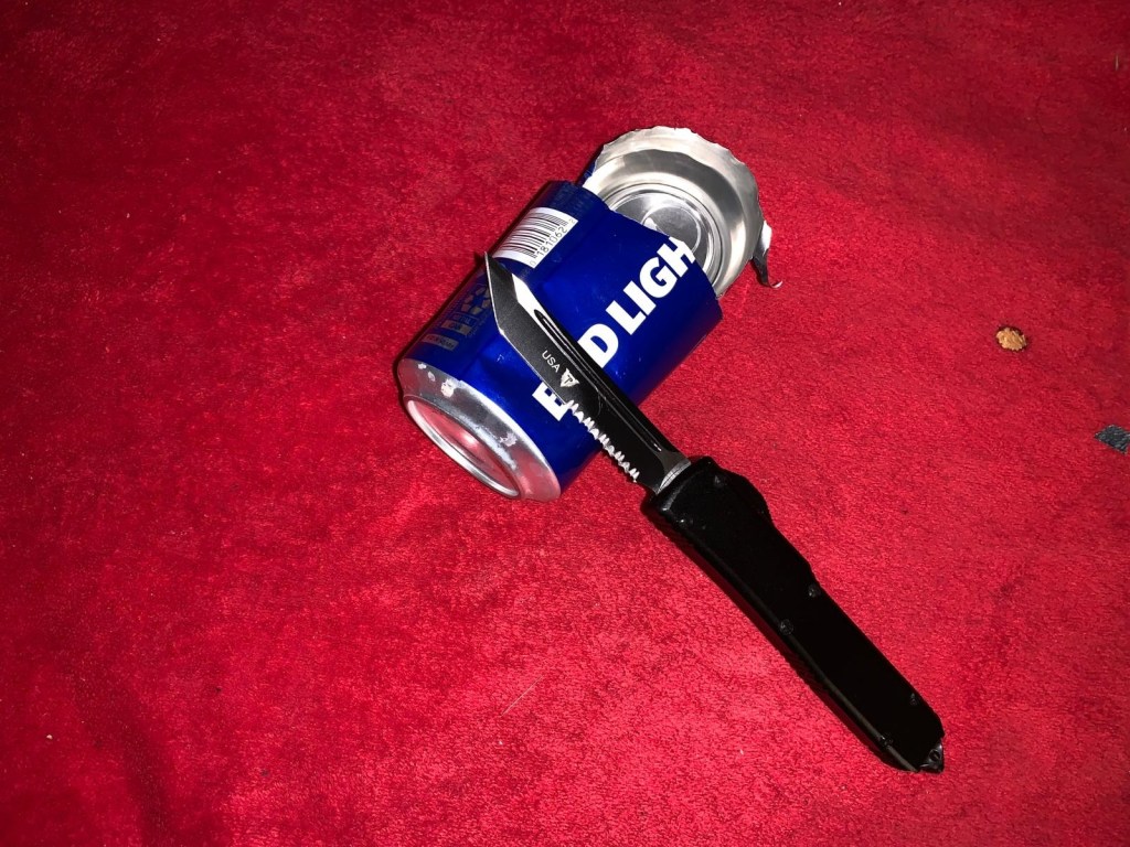 One of the more strenuous tests involved cutting through a metal can. While the knife handled the task decently, it showed slight signs of stress. The blade did not dull instantly, but there was some bending on the tip after cutting through the can. This is a typical challenge for many knives, particularly automatic OTF models. While the Patriot Tactical Overwatch held up well, it may not be the ideal choice for continuous heavy-duty tasks like can cutting.