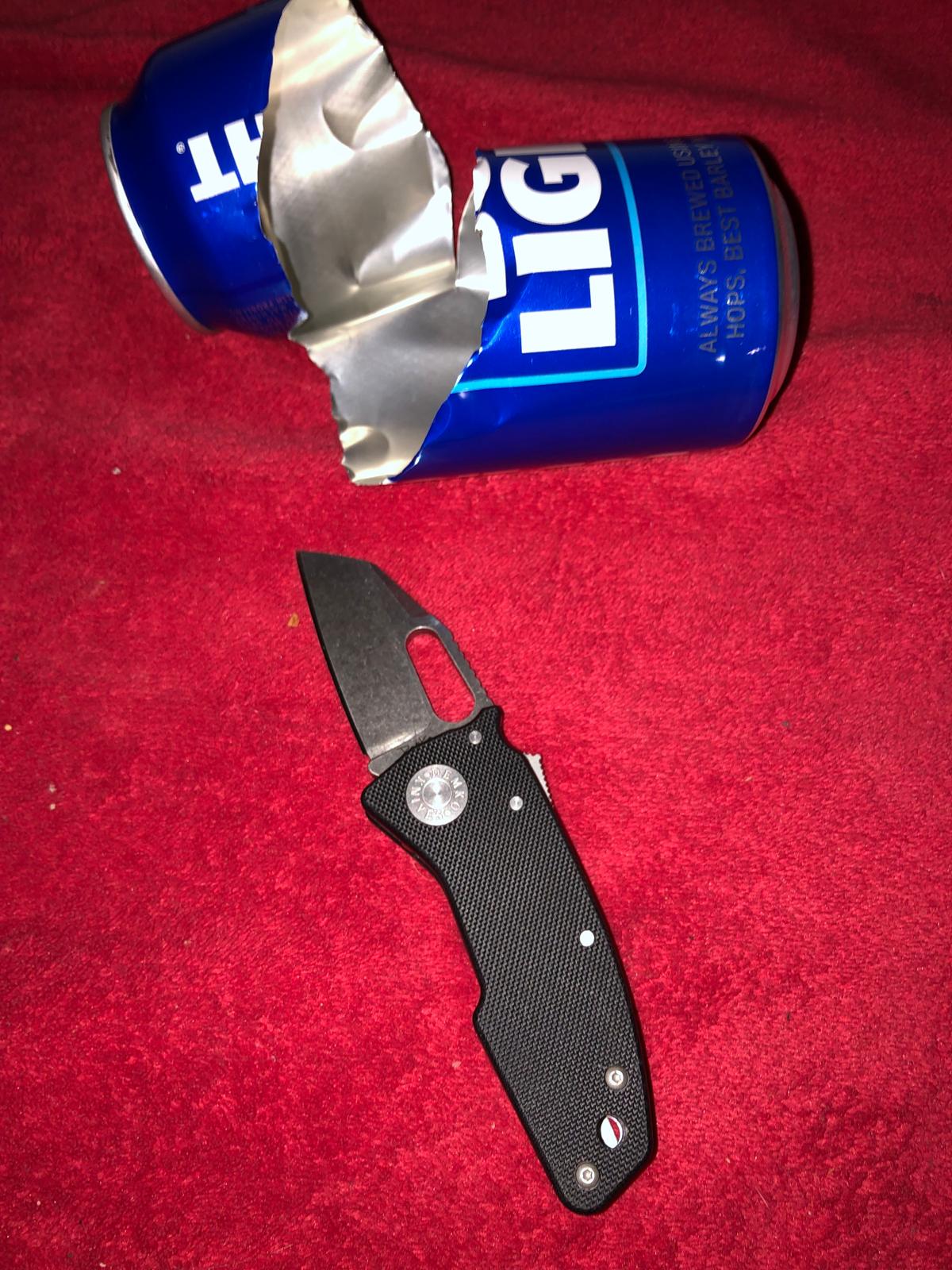 In testing against aluminum cans, the blade punctured and sliced without sustaining damage, showcasing its toughness and resilience.