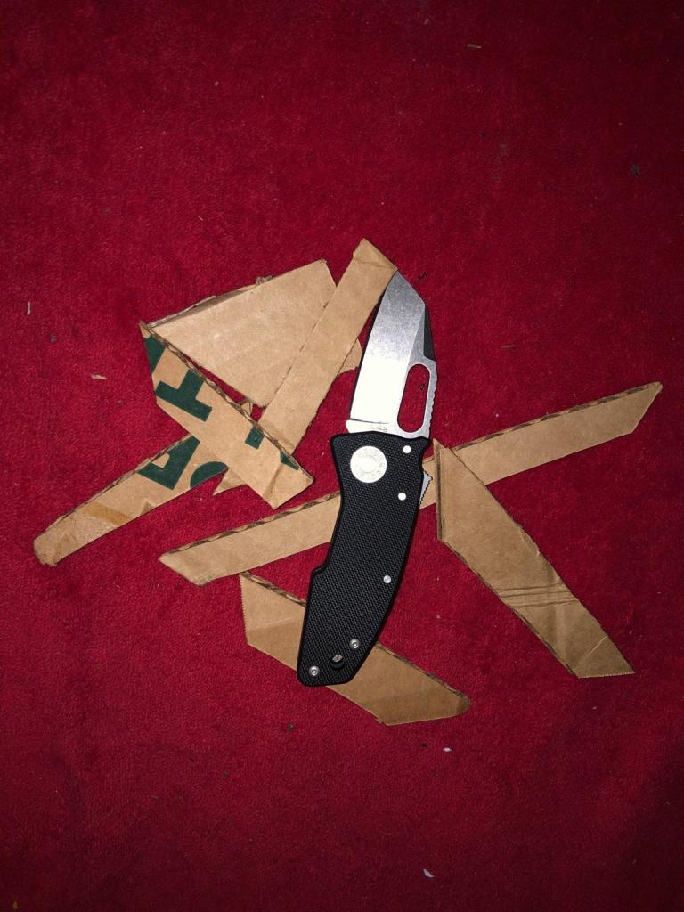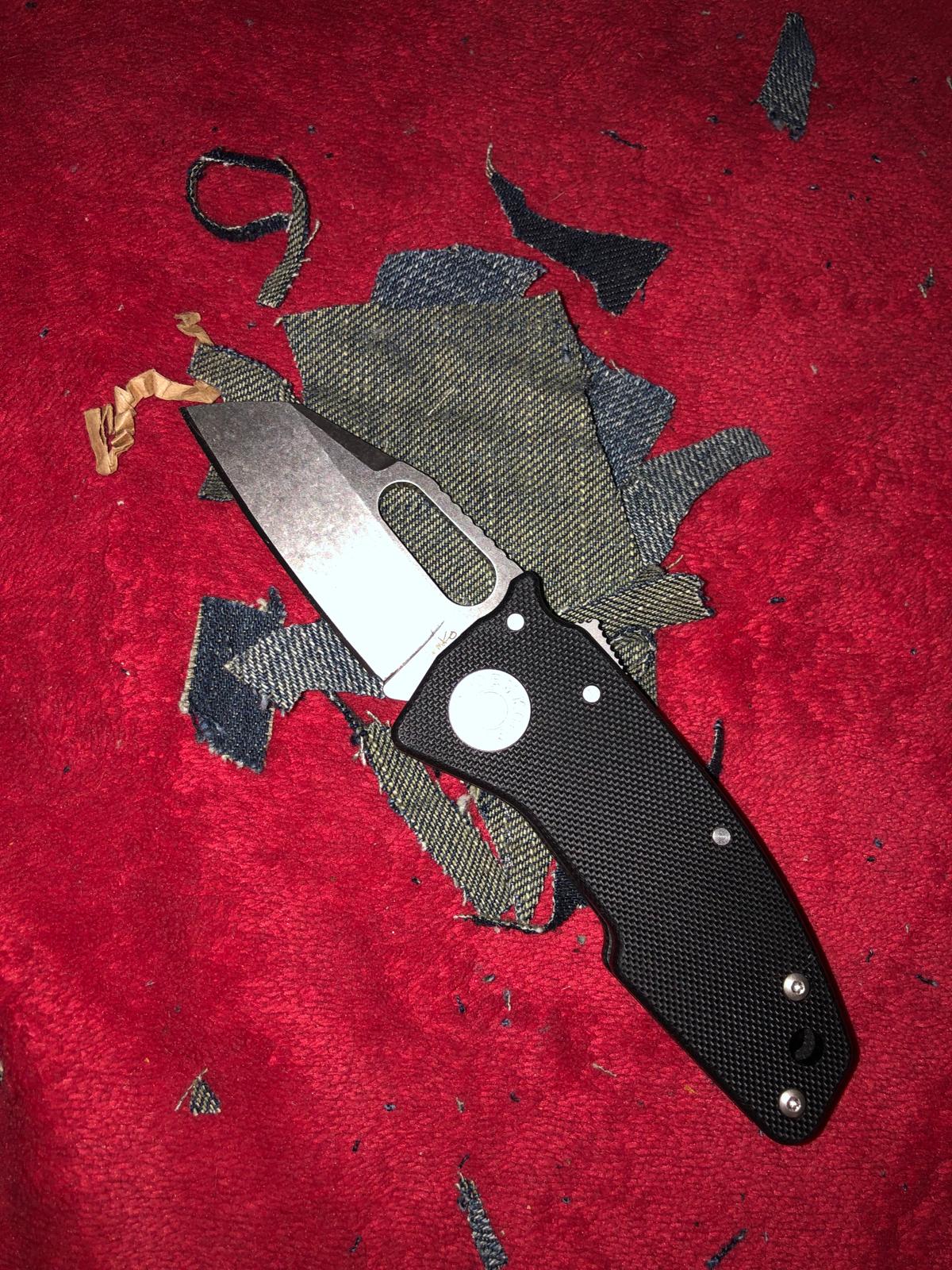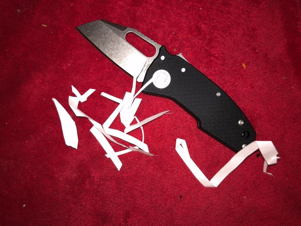 The knife sliced through heavy denim fabric with ease, requiring minimal force, which speaks to its sharpness and edge geometry.
