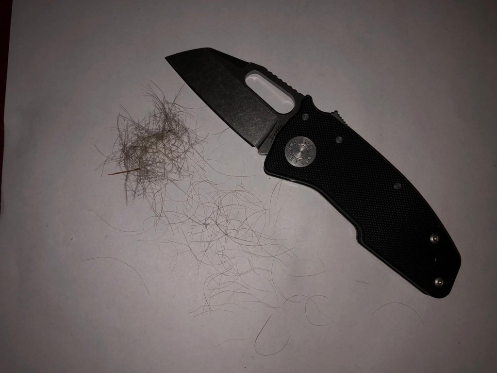 The blade cleanly shaved hair from the forearm with minimal pressure, indicating a finely honed edge suitable for precision tasks.