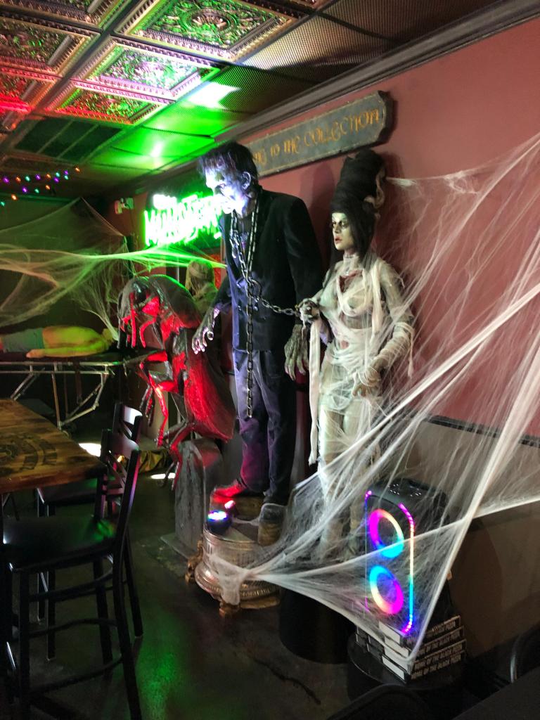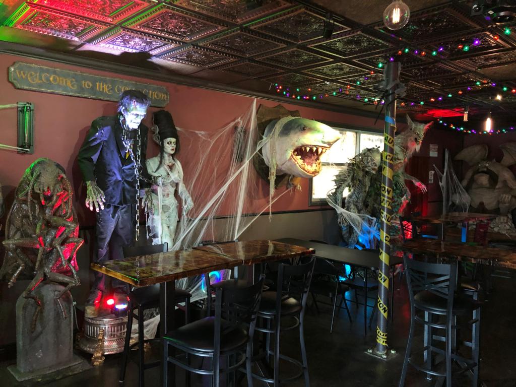 Every corner of Sliced Pizza hides a surprise. From animatronic figures that move when you least expect it to walls decorated with vintage horror masks, the decor immerses guests in a world that feels part haunted house, part movie set.