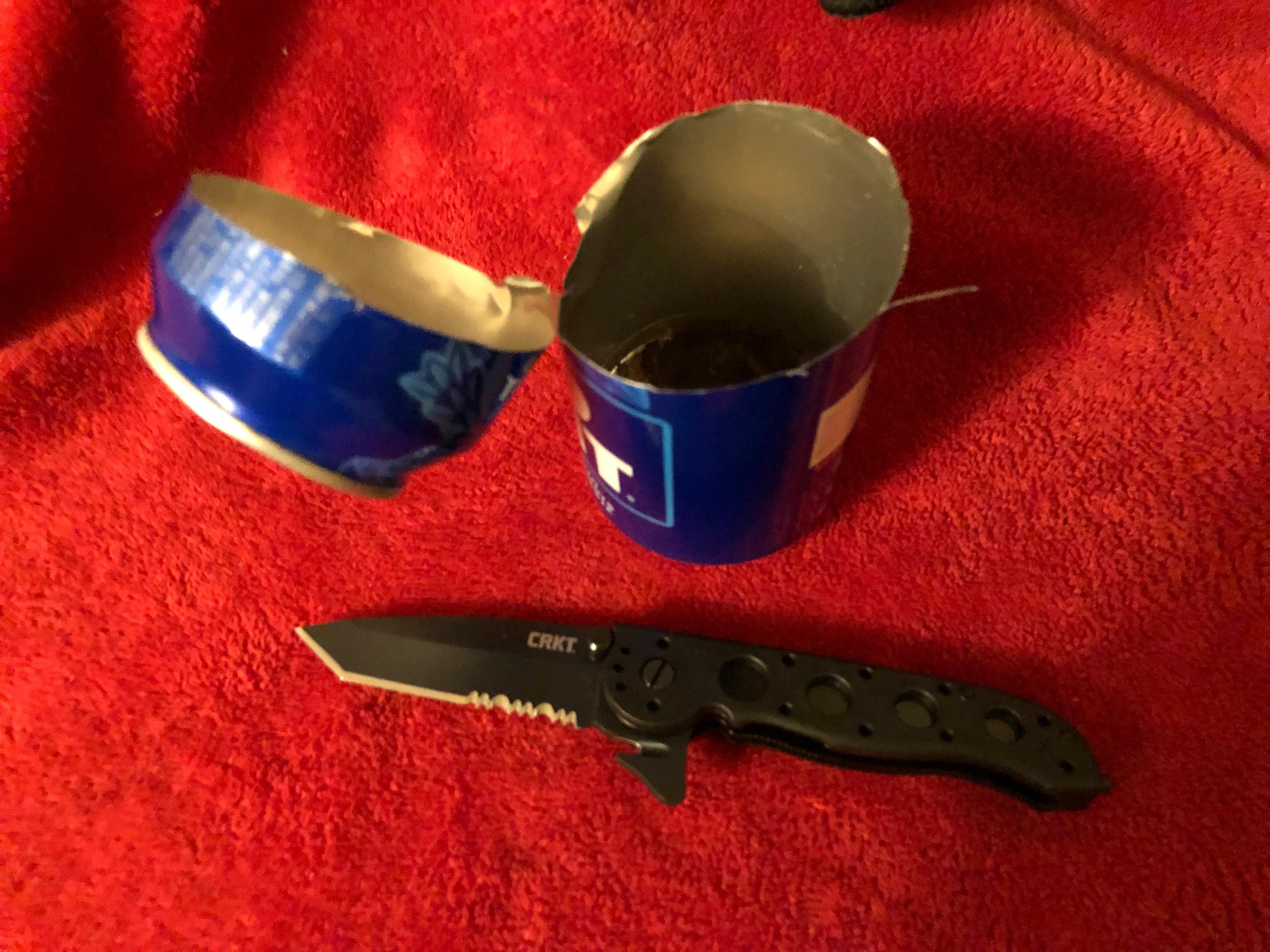 In a controlled test environment, the blade was used on thin aluminum can material. The tanto tip punctured cleanly, and short slicing motions cut through without rolling or deformation of the edge. While not recommended for routine use, the test demonstrated the blade’s durability.