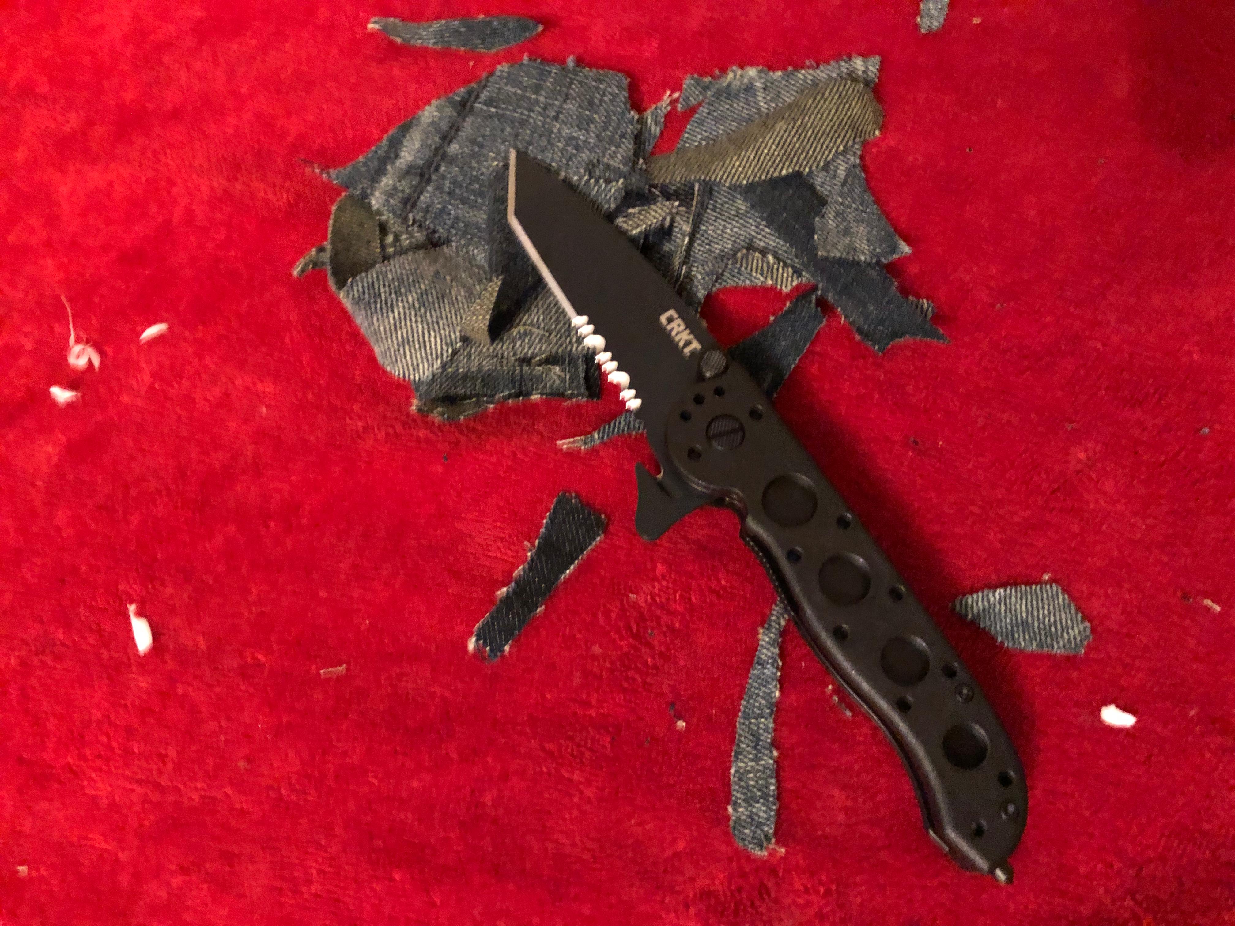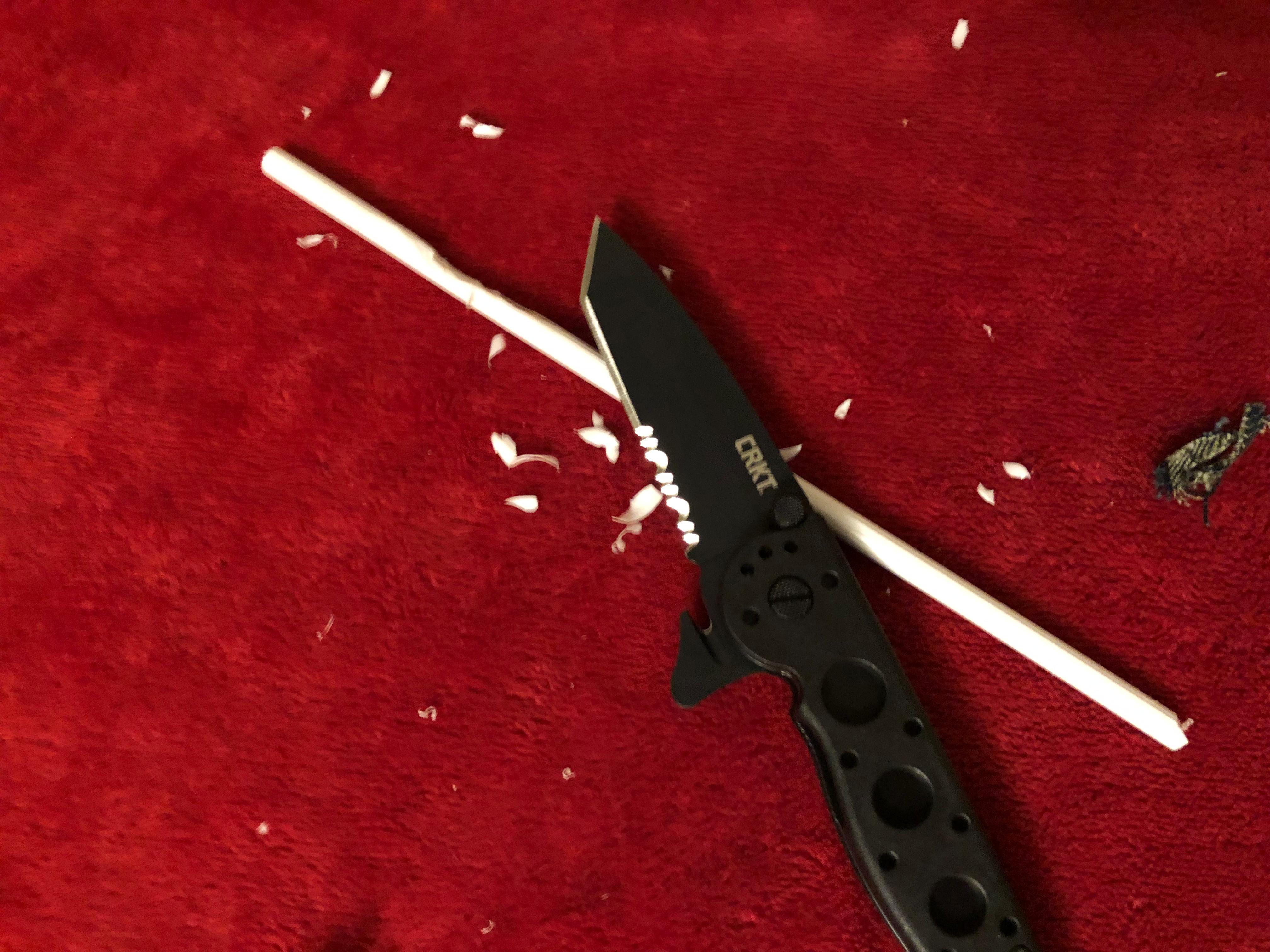Single and folded layers of denim were cut to test fibrous material performance. The serrations cut cleanly and quickly, requiring minimal force. The tanto blade’s straight edge helped maintain control during push cuts.