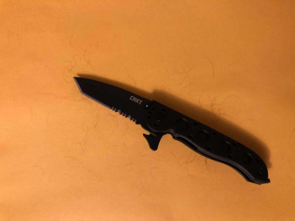 Testing the fine edge against arm hair showed that the blade could shave hair with moderate pressure. This confirmed a serviceable factory edge, appropriate for a tactical knife that prioritizes toughness over razor-thin geometry.